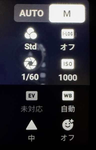 タッチスクリーンの右端から左にスワイプすると、撮影パラメーター設定が表示されます。