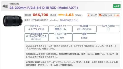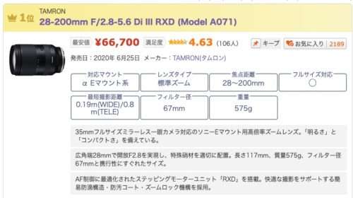 - 価格がソニーズームレンズのほぼ半額である。