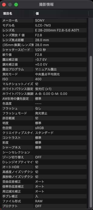 A7IIIで焦点距離28mm、絞りF2.8、シャッタースピード1/20秒、ISO400で0.7段階暗めに撮ったRAW画像をJpeg画像に変換したものです。